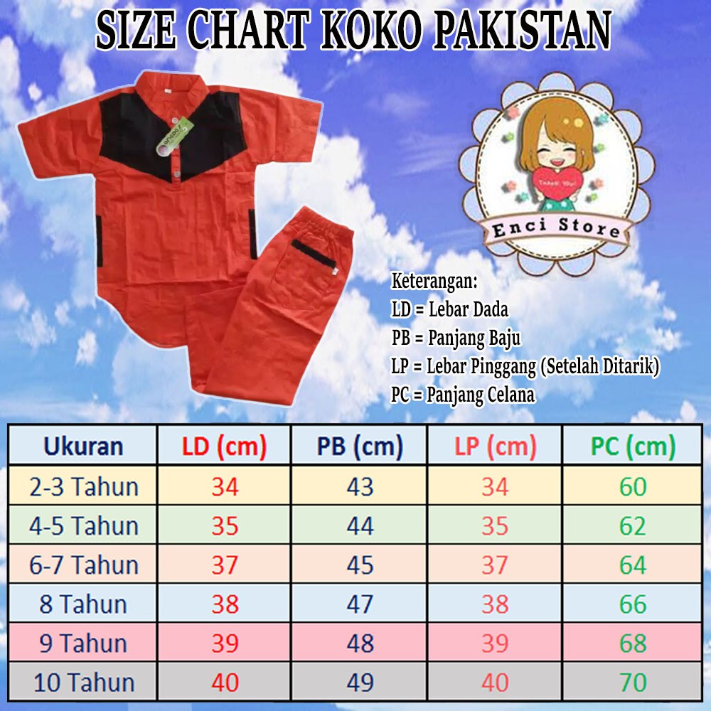 Produk ini memiliki 6 Variasi Ukuran yaitu : 2-3 Tahun,4 Tahun,5 Tahun,6-7 Tahun,7-8 Tahun,9-10 Tahun,